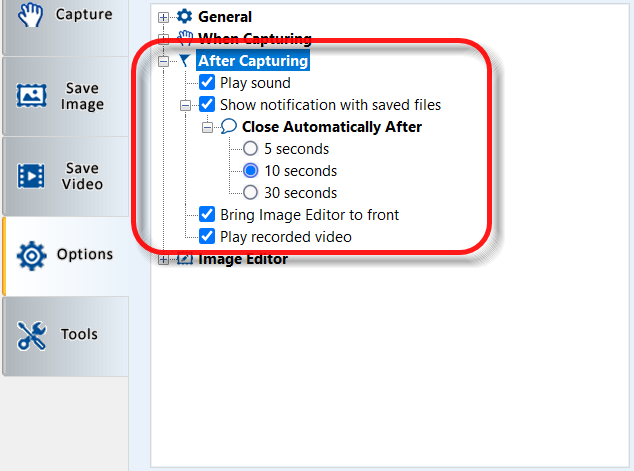 Show notification with saved files - Check to show self-closing notification displayed beside the desktop toolbar. Choose a duration from 5, 10, and 30 seconds.