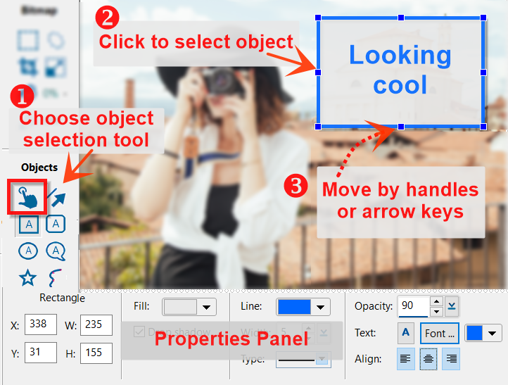 To select multiple objects, hold down Ctrl or Shift and click the object. The first selected object is the anchor object for alignment (handles are